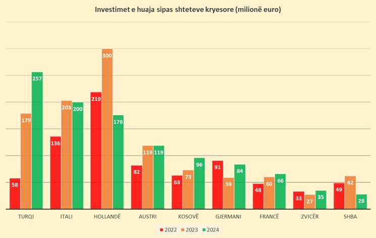 Pas Turqisë, investitori i dytë më i madh për vitin 2024 ishte Italia, me një fluks total prej 200 milionë eurosh. Investimet italiane kanë pësuar një rënie të lehtë me 1.5% krahasuar me të njëjtën periudhë të një viti më parë dhe orientohen sidomos në aktivitetet e shërbimeve.