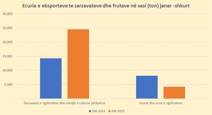 Të dhënat zyrtare të INSTAT tregojnë se shitjet e sasive të zarzavateve jashtë vendit shënuan rritje vjetore me 71% në janar-shkurt 2025, por në të njëjtën periudhë eksportet e frutave pësuan rënie vjetore me 48%.