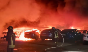 Zjarri shpërtheu në orët e para të së hënës, ndërsa imazhet nga dronët treguan një rresht makinash të djegura plotësisht në hapësirën e parkimit të koncesionarit, sipas The Guardian.