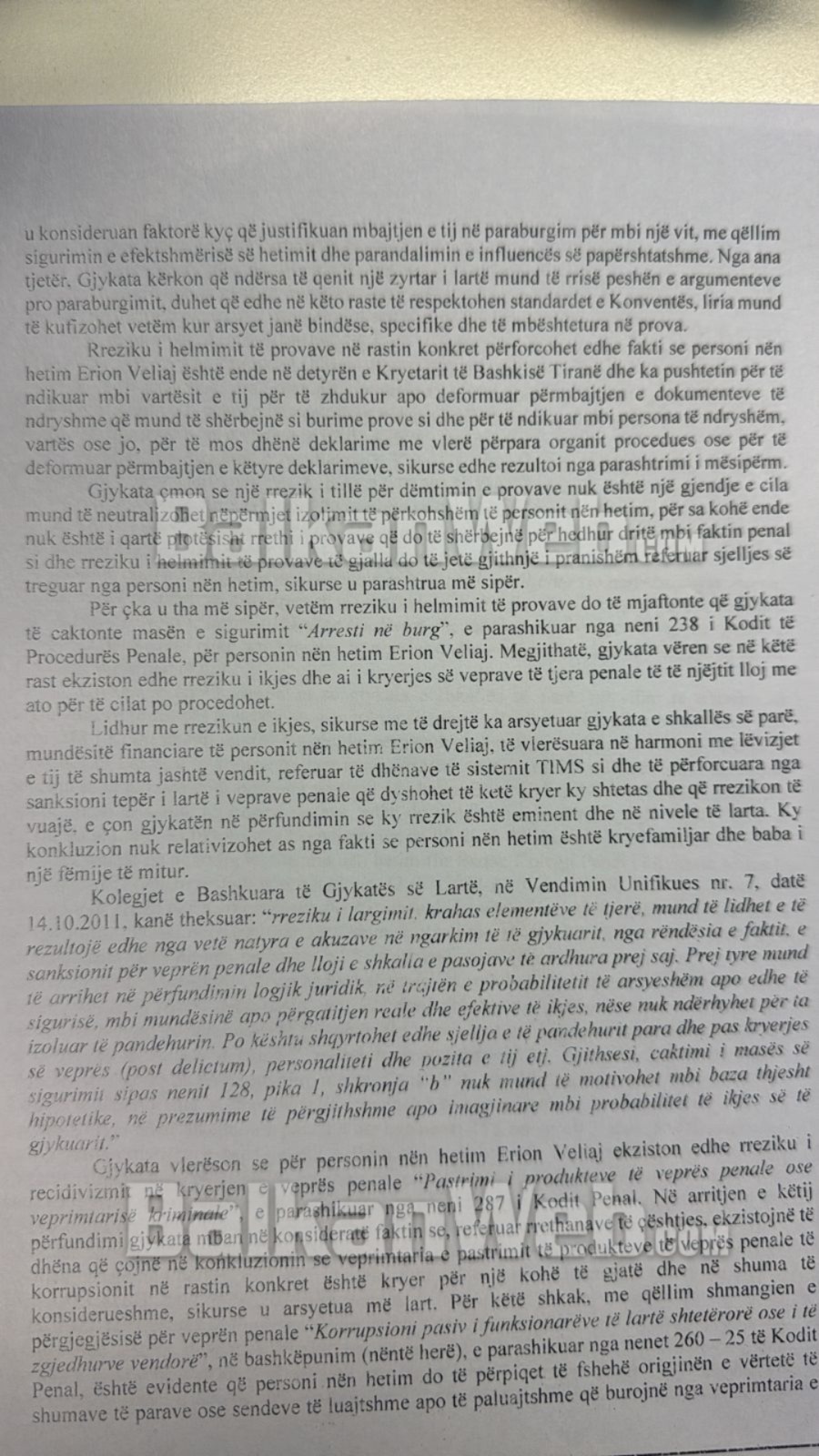 Në vendimin e firmosur nga gjyqtari Engert Pëllumbi, që shfaqet në dokumentet e siguruara theksohet se Veliaj, duke qëndruar në funksionin e tij si kryetar bashkie, përbën rrezik dhe kërcënim për hetuesit dhe dëshmitarët, si dhe mund të dëmtojë provat.