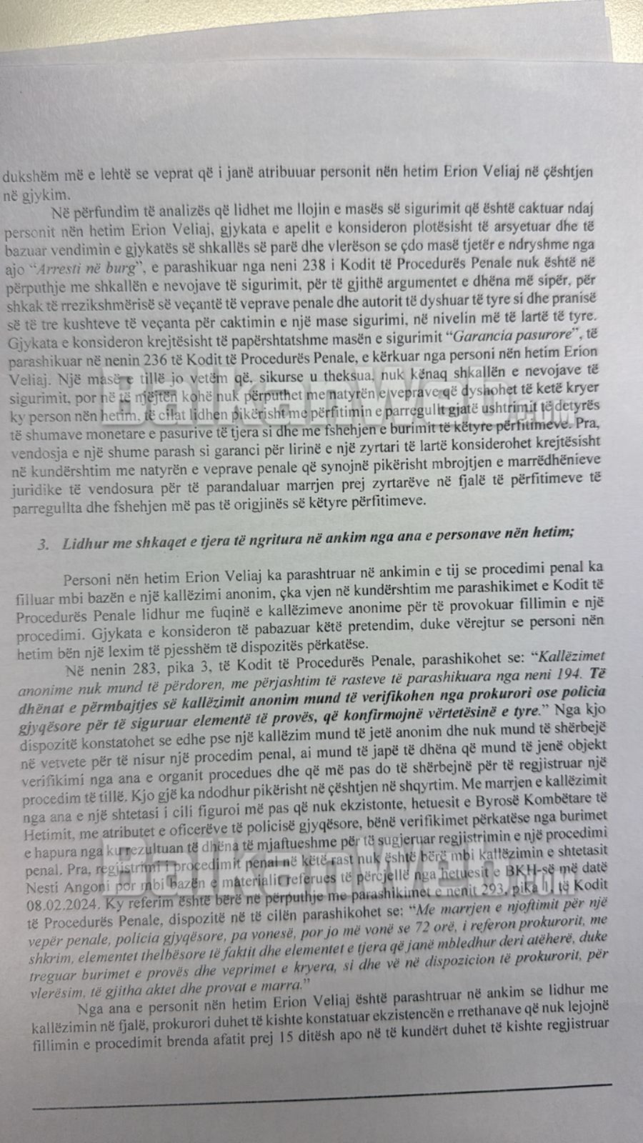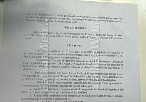 Sipas vendimit të zbardhur nga Gjykata e Posaçme e Apelit, i siguruar për BalkanWeb , masa e sigurisë “arrest me burg” u konfirmua mbi arsyetimin se Veliaj paraqet një rrezik real për pengimin e hetimeve.