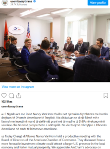 E ngarkuara me punë në Ambasadën Amerikane në Tiranë, Nancy VanHorn, zhvilloi sot një takim frytdhënës me bordin drejtues të Dhomës Amerikane të Tregtisë.