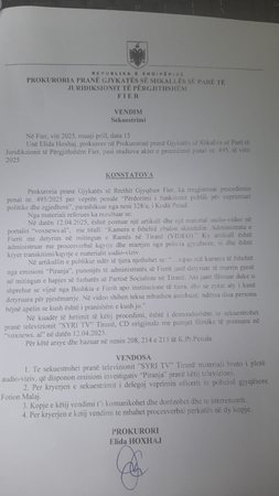 Prokuroria prane Gjykatës së Rrethit Gjyqësor Fier, ka rregjistruar procedimin penal nr. 495/2025 per veprën penale “Përdorimi i funksionit publik për veprimtari politike dhe zgjedhore”, parashikuar nga neni 328/a, i Kodit Penal.
