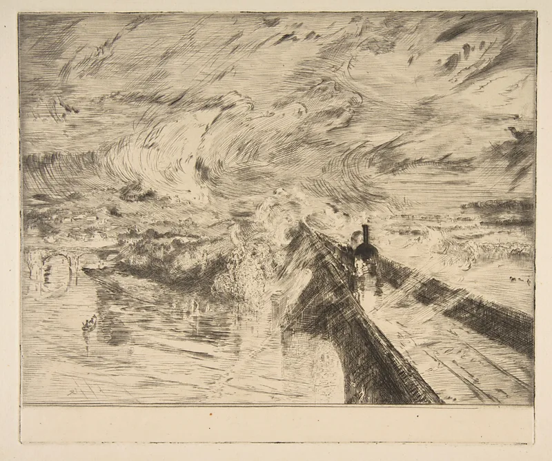 La Lokomotiva e Félix Bracquemond, 1873, e bazuar në shiun, avullin dhe shpejtësinë e Turnerit, u shfaq në ekspozitën e parë impresioniste në Paris (Kredia: Muzeu Metropolitan)