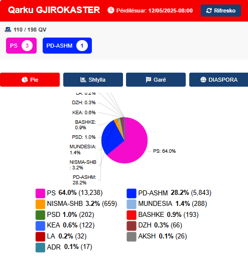 Sipas të dhënave zyrtare të raportuara nga Komisioni Qendror i Zgjedhjeve, Partia Socialiste kryeson bindshëm me 13,238 vota të grumbulluara deri tani.