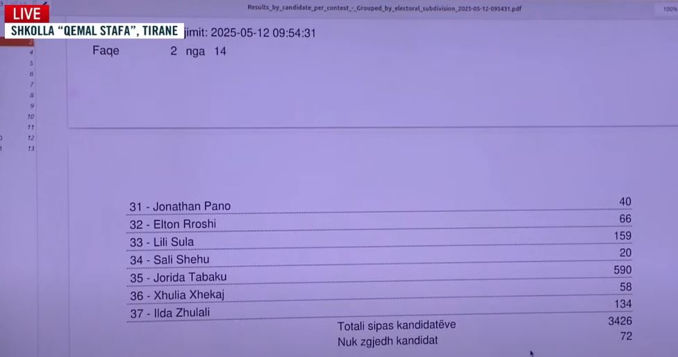 Ndërkohë, Jorida Tabaku nga Partia Demokratike ka siguruar 590 vota, duke konfirmuar mbështetjen e saj në këtë zonë.