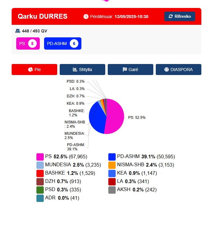 Procesi i numërimit të votave në qarkun e Durrësit është drejt përfundimit, me 448 nga 493 kuti të votimit të numëruara. Sipas të dhënave zyrtare të publikuara nga Komisioni Qendror i Zgjedhjeve, Partia Socialiste e Shqipërisë (PS) ruan epërsinë bindëse me 67,965 vota, që përfaqësojnë 52.5% të votave të vlefshme.