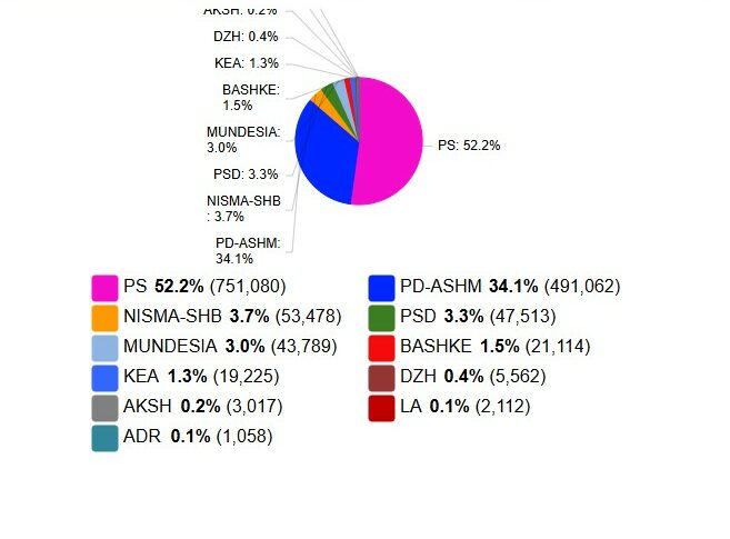 Sipas rezultateve paraprake, Partia Socialiste e Shqipërisë (PS) ka dalë forcë e parë me një shumicë të qartë, duke grumbulluar 751,080 vota, që përbëjnë 52.2% të totalit në shkallë kombëtare.