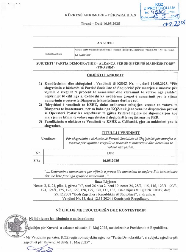 Partia Demokratike ka dërguar në Komisionin e Ankesave dhe Sanksioneve vendimin e keut të KQZ-së Ilirjan Celibashi, i cili urdhëroi vazhdimin dhe përfundimin e numërimit të çdo dokumentacioni zgjedhor të mbërritur nga jashtë vendit. Aty përfshihen edhe zarfet e mbërritura nga Greqia.