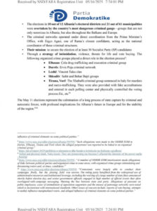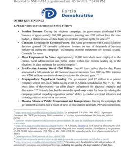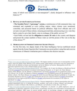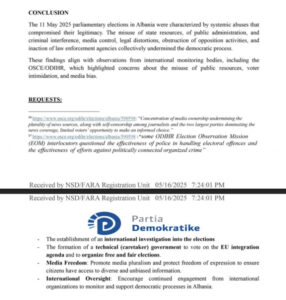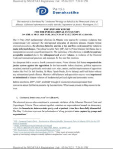 Partia Demokratike ka dorëzuar në Shtetet e Bashkuara një raport të detajuar mbi shkeljet e pretenduara gjatë zgjedhjeve parlamentare të 11 majit 2025, duke akuzuar qeverinë për përfshirje të grupeve kriminale, keqpërdorim të administratës publike dhe shkelje të lirive themelore. Dokumenti, i regjistruar më 16 maj pranë Departamentit të Drejtësisë të SHBA, u dorëzua përmes kompanisë lobuese “Continental Strategy”.