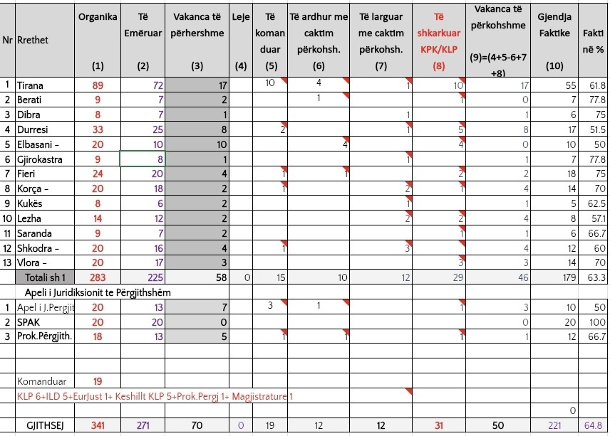 Vetëm Struktura e Posaçme Kundër Korrupsionit dhe Krimit të Organizuar (SPAK) rezulton me plotësim 100% të organikës. Në organikën e SPAK janë të emëruar 20 prokurorë.