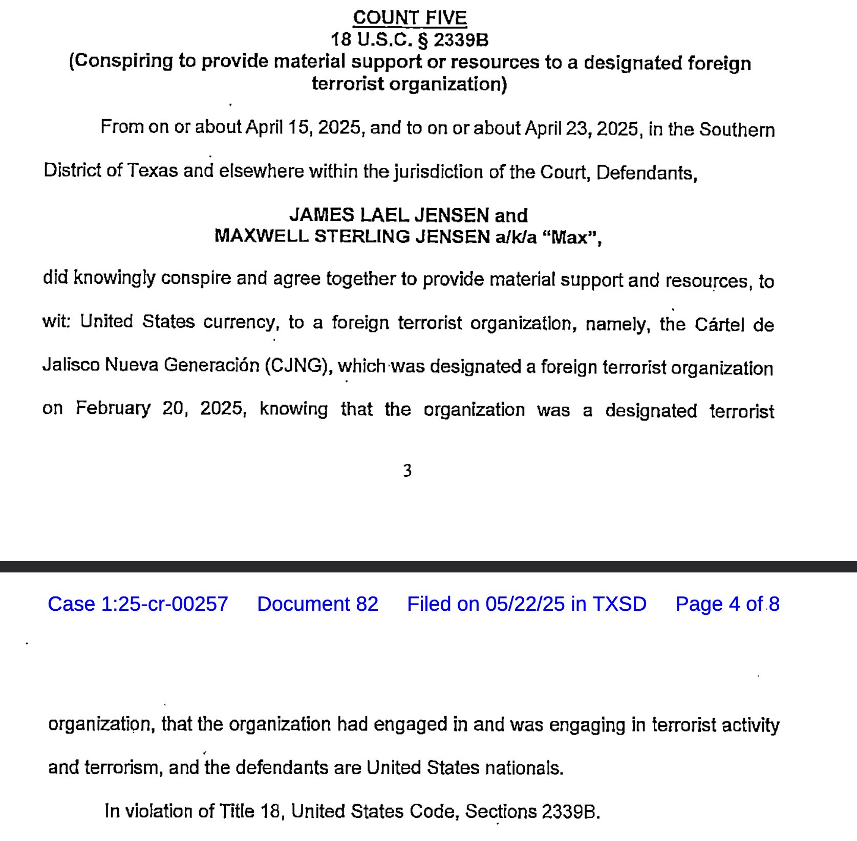 CJNG u caktua më 20 shkurt 2025 si Organizatë Terroriste e Huaj nga administrataTrump. Akuza e re për ofrimin e mbështetjes materiale për një grup terrorist do të thotë se familja Jensen e dinte se po bënte biznes me kompani dhe figura të lidhura me CJNG. Ndërmjet shkurtit dhe prillit, kur ata u arrestuan, autoritetet kanë prova që tregojnë se ata dinin për emërtimet terroriste dhe ende me vetëdije bënin biznes me ta.