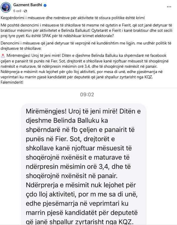 Kreu i Grupit Parlamentar të PD-së, Gazment Bardhi, denoncoi se zëvendëskryeministrja Belinda Balluku ka keqpërdorur mësuesit dhe nxënësit në Fier për aktivitete elektorale. Sipas Bardhit, mësuesit dhe nxënësit janë detyruar të ndërpresin mësimin dhe të marrin pjesë në panairin e punës, ku merrte pjesë Balluku. Ai kërkoi që SPAK të ndëshkojë krimet zgjedhore.