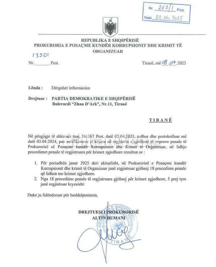 Partia Demokratike me date 02.04.2025 i dërgoi SPAK-ut një shkresë zyrtare, ku kërkonte informacion mbi ecurinë e hetimeve për krimet zgjedhore që nga janari deri në datën e përgjigjes. Në reagimin e vet, kreu i SPAK, Altin Dumani, konfirmoi se ishin regjistruar gjithsej 18 procedimepenale, nga të cilat 5 ishin nisur kryesisht nga prokuroria, ndërsa të tjerat ishin rezultat i kallëzimeve të qytetarëve ose subjekteve të ndryshme.