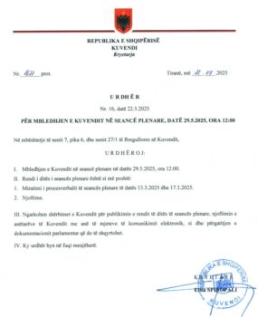 Grupi Parlamentar i Partisë Demokratike është njohur me urdhrin tuaj nr. 16, datë 22.05.2025 “Për mbledhjen e Kuvendit në seancë plenare, datë 29.05.2025, ora 12:00”, i cili ndër të tjera bie ndesh me nenin 45 të Rregullores së Kuvendit, ku theksohet se: “Në fund të rendit të ditës çdo deputet mund të diskutojë për çështje të ndryshme që ai i konsideron se duhen bërë publike në seancë plenare…. Koha e përgjithshme për diskutimin e këtyre çështjeve nuk mund te jetë më shumë se 60 minuta.”.