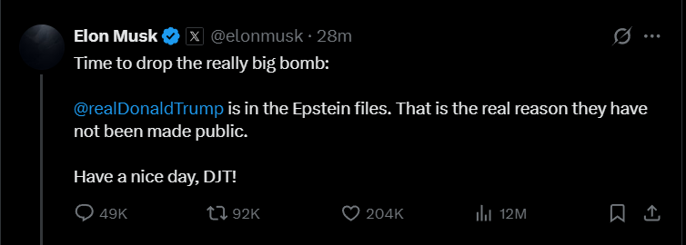 Elon Musk, një nga bashkëpunëtorët më të ngushtë të presidentit të SHBA-së Donald Trump… të paktën deri para pak ditësh, ka bërë një deklaratë tejet të fortë teksa shkruan se Trump shfaqet në dosjet e Jeffrey Epstein.