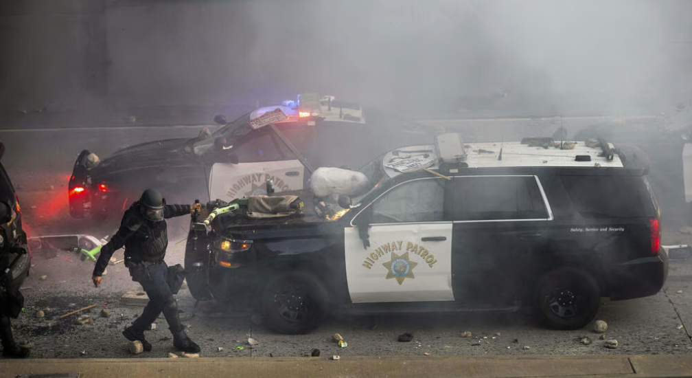 Trazirat në Kaliforni rifilluan herët në mëngjes të dielën sipas kohës lokale, ndërsa protestuesit u përleshën me trupat e armatosura të Gardës Kombëtare të vendosura në rrugë. Demonstruesit bërtitën “Turp!” dhe “Shkoni në shtëpi!” ndaj ushtarëve. Pasi disa aktivistë iu afruan shumë Gardës Kombëtare, një grup tjetër personeli sigurie me rroba civile iu afrua dhe përdori granata tymuese.