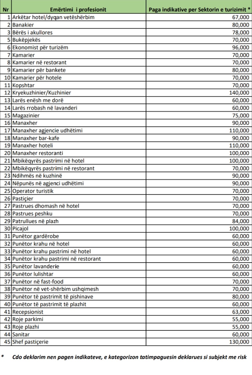 Administrata Tatimore ka publikuar listën e pagave referencë për 45 profesione në sektorin e turizmit, për sezonin turistik 2025.