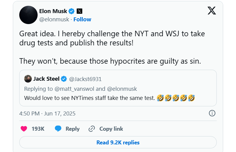 “Ide e shkëlqyer. Me anë të kësaj, unë sfidoj NYT dhe WSJ që të bëjnë teste droge dhe të publikojnë rezultatet! Ata nuk do ta bëjnë, sepse këta hipokritë janë fajtorë për mëkatin e tyre”, shkroi Musk.