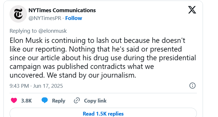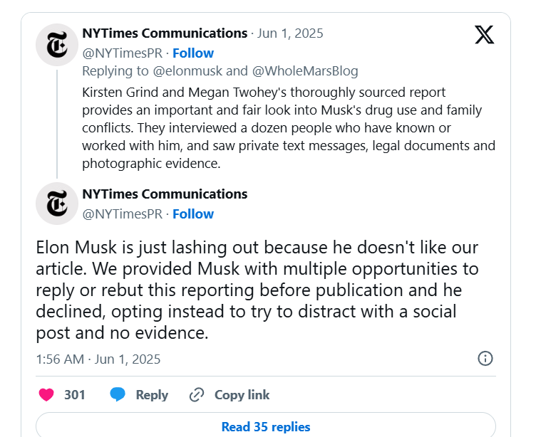 “Raporti i Kirsten Grind dhe Megan Twohey, i bazuar plotësisht në burime, ofron një vështrim të rëndësishëm dhe të drejtë mbi përdorimin e drogës dhe konfliktet familjare të Musk. Ata intervistuan dhjetëra njerëz që e kanë njohur ose kanë punuar me të dhe panë mesazhe private, dokumente ligjore dhe prova fotografike”, shkroi llogaria e NY Times Communications.