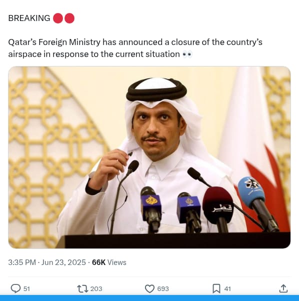 Mbyllja e hapësirës ajrore vjen mes luftës në zhvillim mes Izraelit dhe Iranit dhe pas sulmit amerikan ndaj tre objekteve bërthamore iraniane dhe mes frikës për zgjerimin e luftës në rajon.