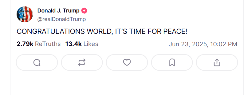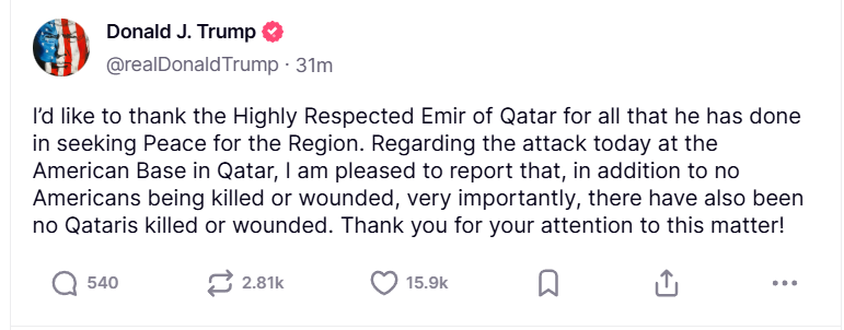 “URIME BOTË, ËSHTË KOHA PËR PAQE! Dua të falënderoj Emirin e Lartë të Katarit për gjithçka që ka bërë në kërkimin e Paqes për Rajonin. Lidhur me sulmin e sotëm në Bazën Amerikane në Katar, kam kënaqësinë të raportoj se, përveçse nuk ka pasur amerikanë të vrarë ose të plagosur, dhe shumë e rëndësishme, nuk ka pasur as katarianë të vrarë ose të plagosur. Faleminderit për vëmendjen tuaj ndaj kësaj çështjeje! Irani zyrtarisht i është përgjigjur shkatërrimit tonë të objekteve të tyre bërthamore me një përgjigje shumë të dobët, të cilën e prisnim, dhe e kemi kundërshtuar shumë në mënyrë efektive. Janë qëlluar 14 raketa – 13 u rrëzuan dhe 1 u “lirua”, sepse po shkonte në një drejtim jo kërcënues. Jam i kënaqur të raportoj se ASNJË amerikan nuk u lëndua dhe mezi u shkaktua ndonjë dëm. Më e rëndësishmja, ata e kanë nxjerrë të gjithën nga “sistemi” i tyre dhe, shpresojmë, nuk do të ketë më URREJTJE. Dua të falënderoj Iranin që na dha njoftim të hershëm, gjë që bëri të mundur që të mos humbiste asnjë jetë dhe askush të mos lëndohej. Ndoshta Irani tani mund të vazhdojë drejt Paqes dhe Harmonisë në Rajon dhe unë do ta inkurajoj me entuziazëm Izraelin të bëjë të njëjtën gjë. Faleminderit për vëmendjen tuaj ndaj kësaj çështjeje!” – shkruan Trump.