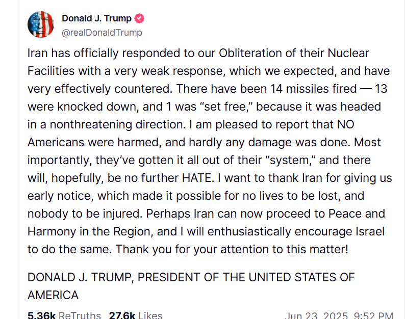 Në disa postime në Truth Social, shefi i Shtëpisë së Bardhë, shkruan se raketat iraniane nuk shkaktuan asnjë dëm me 13 nga 14 prej tyre që u kapën në ajër.