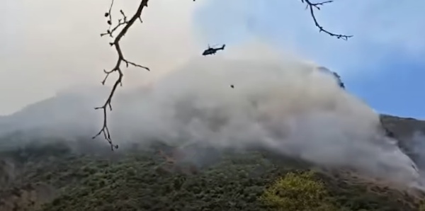 Një helikopter i ushtrisë po ndihmon për shuarjen e zjarrit sidomos aty ku është e pamundur të ndërhyhet nga toka.