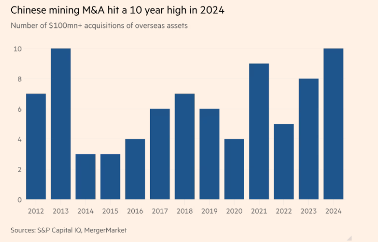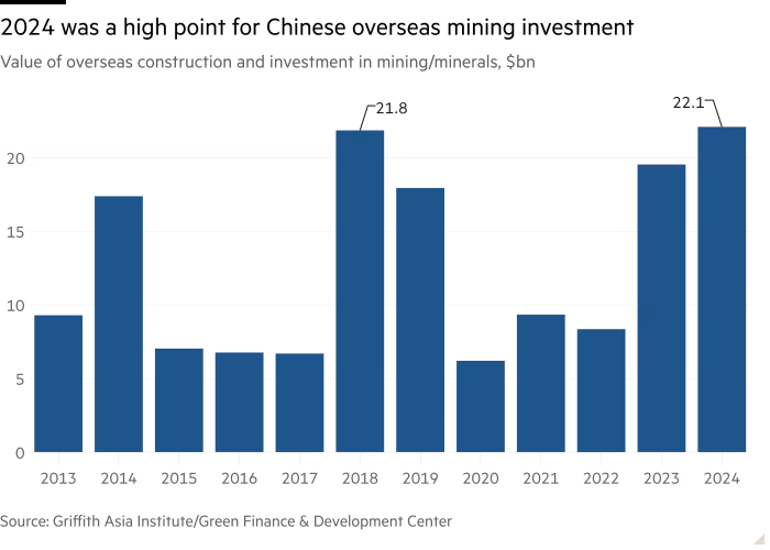 Kërkesa e madhe e vendit për lëndë të para , pasi Kina është shpenzuesi më i madh në botë i shumicës së mineraleve, do të thotë se kompanitë e saj të minierave kanë një histori të gjatë investimi jashtë vendit. Analistët dhe investitorët thonë se rritja e marrëveshjeve pasqyron pjesërisht përpjekjet e Kinës për t’iu kundërvënë përkeqësimit të klimës gjeopolitike, e cila po e bën atë gjithnjë e më të padëshiruar si investitor në vende kyçe si Kanadaja dhe SHBA-ja.