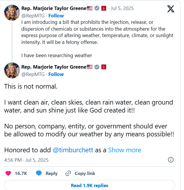 “Po paraqes një projektligj që ndalon injektimin, lëshimin ose shpërndarjen e kimikateve ose lëndëve në atmosferë me qëllimin e qartë të ndryshimit të motit, temperaturës, klimës ose intensitetit të dritës së diellit. Do jetë një vepër penale”, shkroi Greene në X.