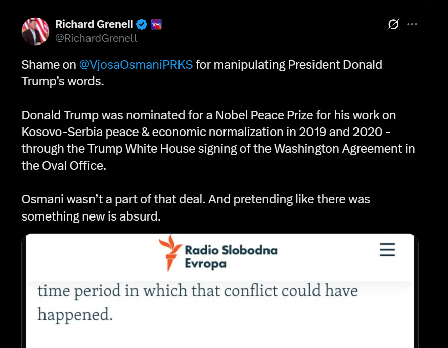 “Turp për Vjosa Osmanin që manipuloi fjalët e presidentit Donald Trump. Donald Trump u nominua për Çmimin Nobel për Paqen për punën e tij në paqen dhe normalizimin ekonomik midis Kosovës dhe Serbisë në vitet 2019 dhe 2020 – përmes nënshkrimit të Marrëveshjes së ëashingtonit nga Trump në Zyrën Ovale në Shtëpinë e Bardhë. Osmani nuk ishte pjesë e asaj marrëveshjeje. Dhe të pretendosh sikur kishte diçka të re është absurde”, shkroi Grenell në X.