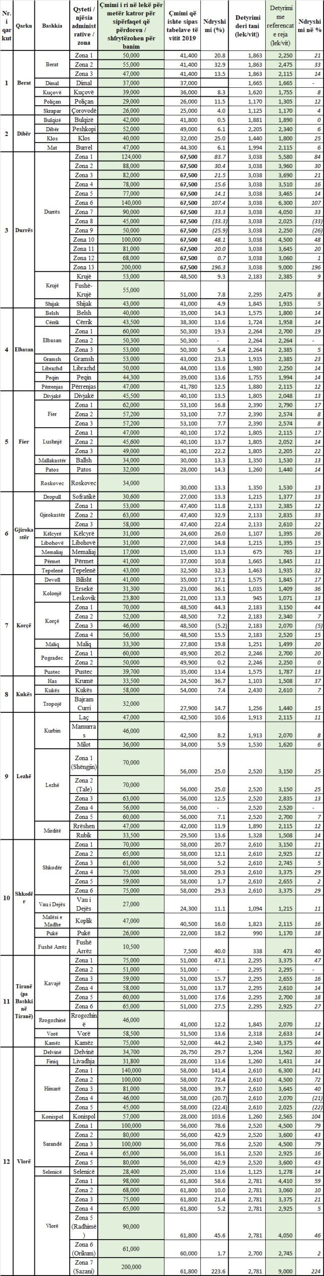 Vlera e referencës së mëparshme për qytetin e Elbasanit ishte 50,300 lekë/m2. Propozohen vlera të reja përkatësisht 60 mijë lekë/m2 për zonën nr.1 dhe 53 mijë lekë për zonën nr.3.