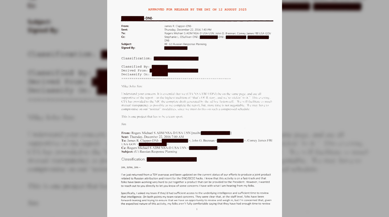 Korrespondenca tepër sekrete, e publikuar të mërkurën, tregon ish-kreun e Inteligjencës Kombëtare James Clapper duke i udhëzuar shefat e inteligjencës të “bëjnë kompromis me procedurat normale” për të nxituar një Vlerësim të Politizuar të Komunitetit të Inteligjencës (ICA) të vitit 2017, pavarësisht shqetësimeve nga drejtori i atëhershëm i Agjencisë së Sigurisë Kombëtare (NSA), Mike Rogers.
