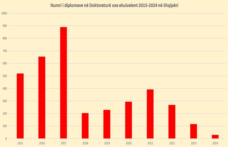 Numri i diplomave të doktoraturave po tkurret me shpejtësi këto vitet e fundit, por me 2024 u dhanë vetëm 31 të tilla, ose 73 për qind më pak se me 2023 dhe shumë më pak se me vitin 2017 ku u shpërndanë 890 doktoratura.