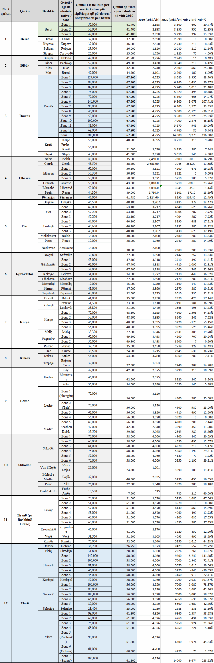 Rritja e detyrimeve për pronarët e garazheve dhe bodrumeve në rrethe pritet të variojë nga 0.2% deri në 196%, në të njëjta vlera që pritet të ndryshojnë edhe çmimet e reja të referencës në rrethe.