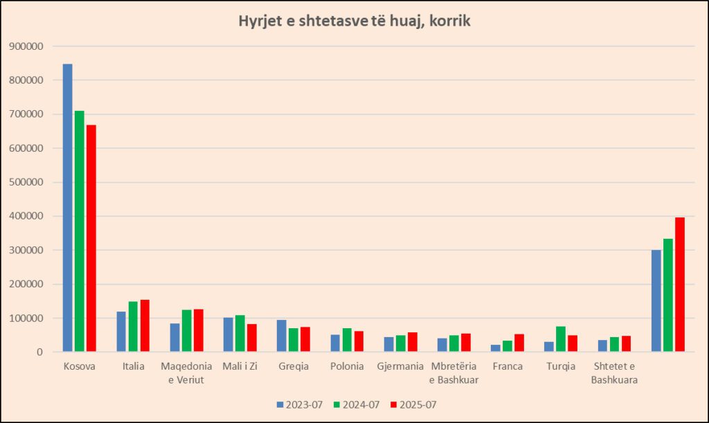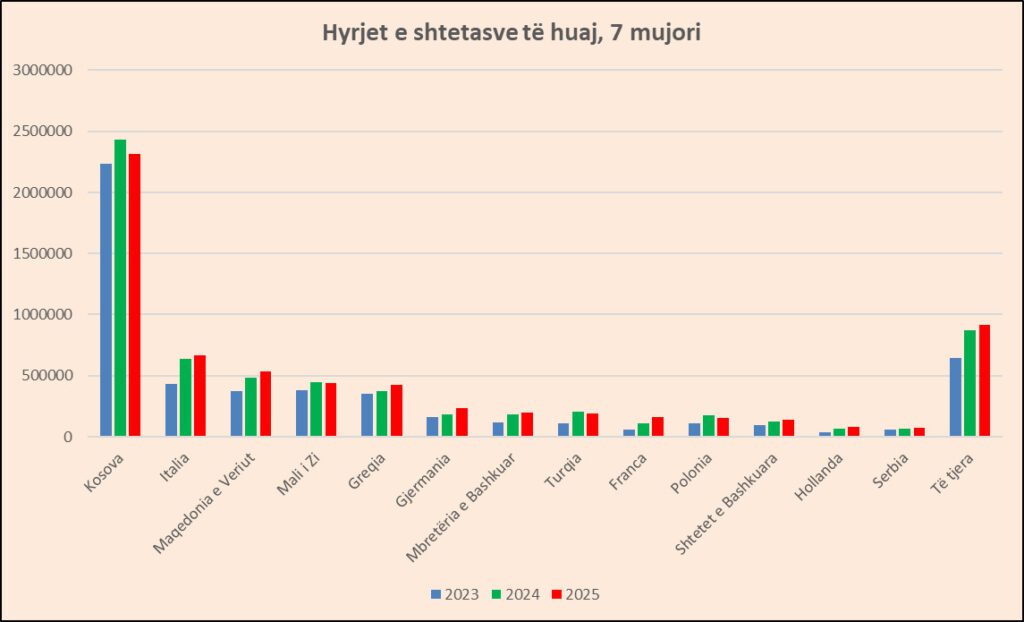 Nëse e shohim gjeografinë sipas shteteve, faktori kryesor që po e ndikon ngadalësimin e turizmit është Kosova. Në 7 mujorin 2025 hynë gjithsej 2.3 milionë shtetas nga Kosova, me rënie 5%, ose 121 mijë shtetas më pak. Për shkak të peshës së lartë që zë turizmi nga shteti fqinjë, me 35% të totalit për 7 mujorin, efekti është i dukshëm. Edhe në korrik hyrjet nga Kosova ranë me 6%.
