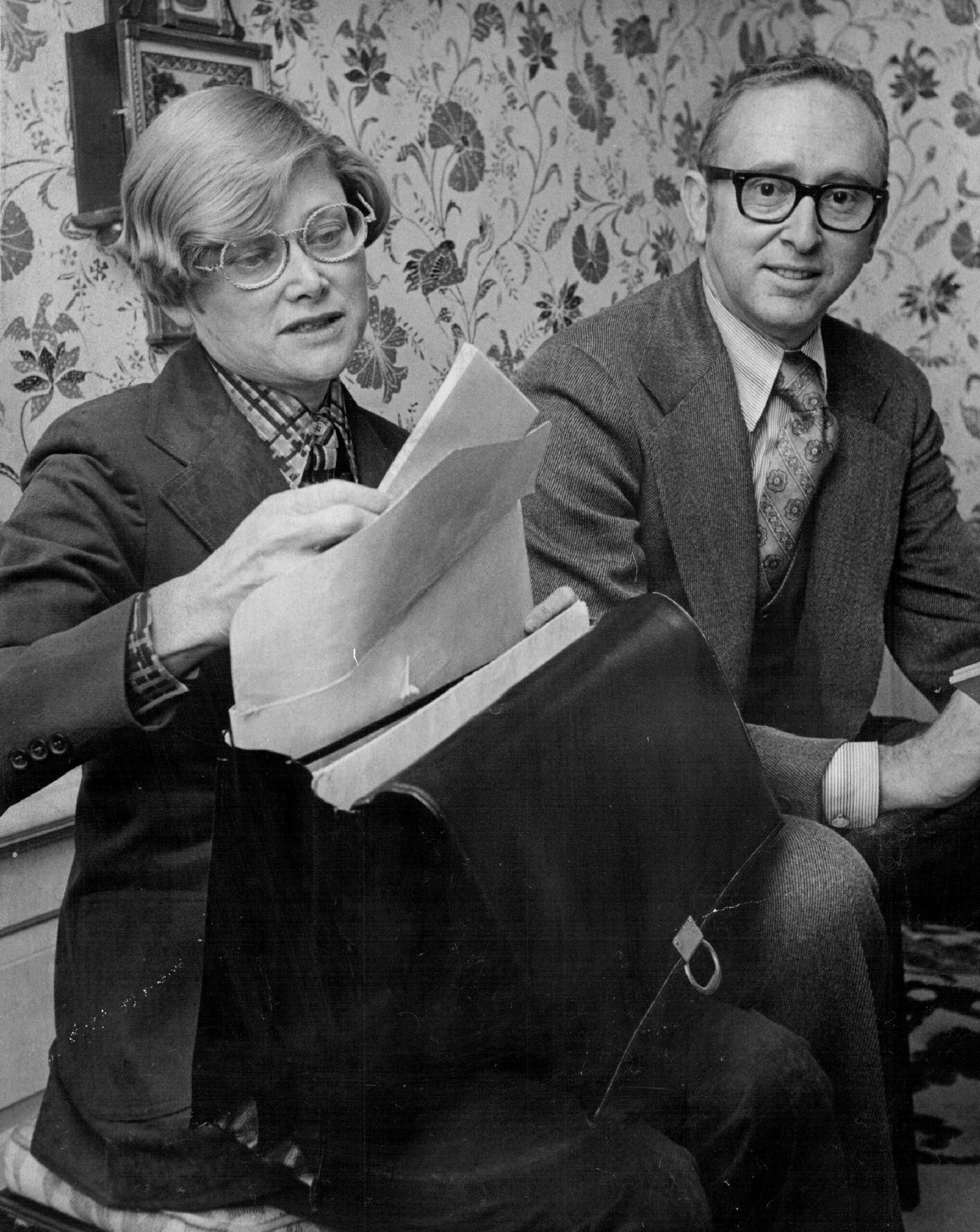 Marion O. Sandler (majtas) dhe Herbert M. Sandler, nënkryetari dhe kryetari i Golden West Financial Corp., më 4 nëntor 1976. (Ed Maker/The Denver Post nëpërmjet Getty Images)