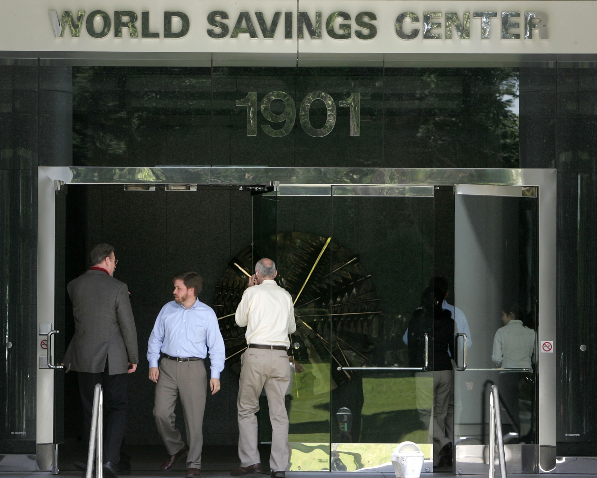 Punëtorët hyjnë në Qendrën Botërore të Kursimeve, selinë e Golden West Financial Corp. më 8 maj 2006, në Oakland, Kaliforni. Wachovia Corp. njoftoi më 7 maj se planifikon të blejë Golden West Financial Corp., e cila zotëron World Savings, për 25 miliardë dollarë në një blerje aksionesh dhe parash me vlerë 15 përqind mbi çmimin e mbylljes së aksioneve të Golden West javën e kaluar. (Justin Sullivan/Getty Images)