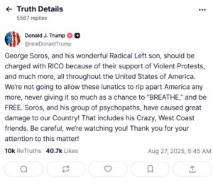 Presidenti i SHBA, Donald Trump, ka shpërthyer me akuza të forta ndaj miliarderit George Soros dhe djalit të tij, Alexander Soros, përmes një postimi në platformën e tij Truth Social.