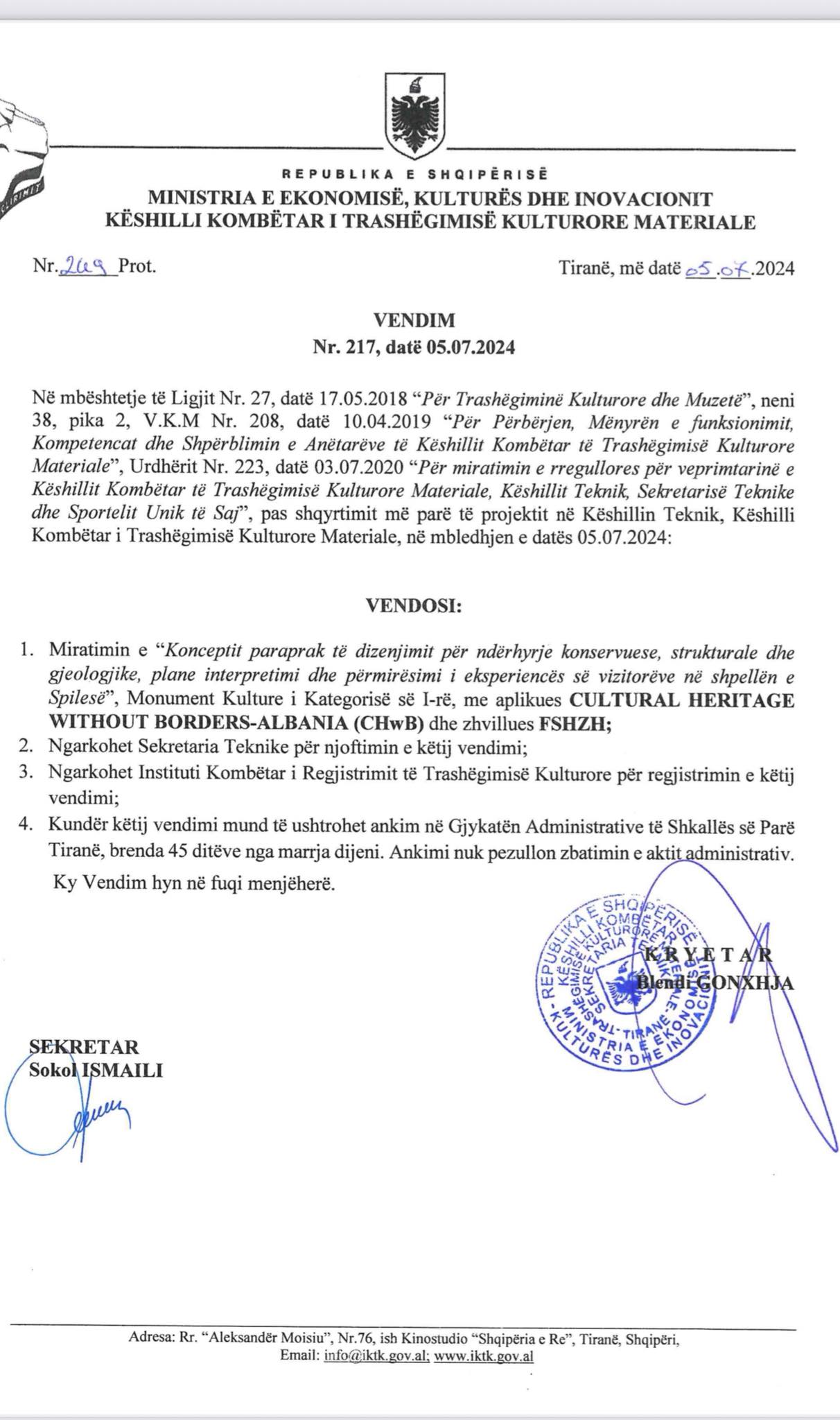 Ai zbulon se është kontaktuar nga një punonjës zyrtar, i cili i ka pohuar se projekti për shpellën e Spilës është përgatitur nga OJF-ja CHëB dhe është miratuar nga ministria e drejtuar nga Blendi Gonxhja.