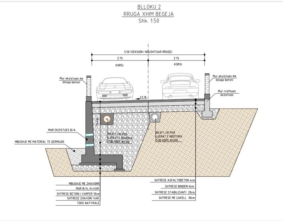 Bëhet fjalë për një gjerësi totale prej 5.5 metrash, në të cilën do të shkëmbehen dy makina sepse rruga do të jetë me dy sense, por nuk është menduar aspak për trortuar. Edhe në ato zona ku më parë ka pasur ndonjë copëz trotuari, firma nuk ka marrë mundimin të ndërhyjë.