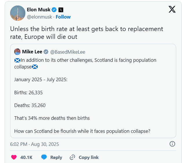 Në një postim në X të shtunën, Musk po i përgjigjej statistikave nga Skocia që tregojnë 34% më shumë vdekje sesa lindje në gjysmën e parë të vitit 2025.