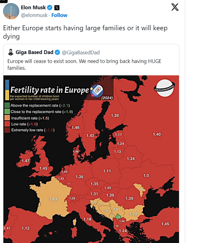 Musk, një avokat i zëshëm për nivele më të larta lindjesh, i cili ka lindur të paktën 14 fëmijë dhe ka dhuruar miliona dollarë për kërkimin mbi fertilitetin, shpesh ka ngritur alarmin për rënien demografike në Evropë. Megjithatë, paralajmërimet e tij shtrihen përtej Evropës. Musk ka cituar të dhëna demografike globale, duke pretenduar se qytetërimi “do shkërmoqet” nëse nivelet e lindjeve nuk rriten. Ai më parë argumentoi se rënia e popullsisë për shkak të fertilitetit të ulët “është një rrezik shumë më i madh për qytetërimin” sesa ndryshimi i klimës.