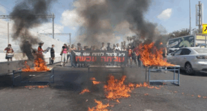 Dhjetëra adoleshentë bllokuan të dielën korsitë veriore të autostradës Ayalon pranë nyjës së Rokach, duke vendosur zjarr në banka shkolle dhe duke protestuar për lirimin e pengjeve që mbahen nga Hamas.