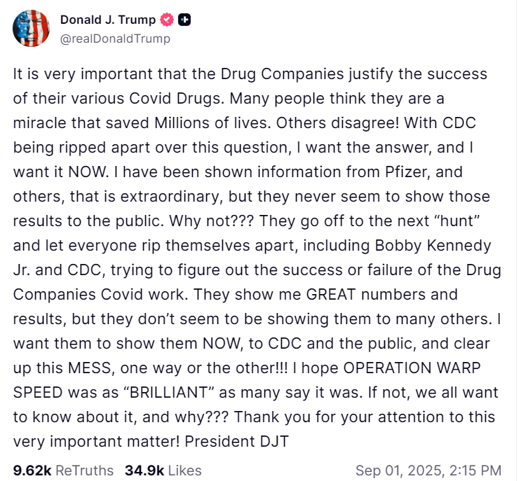 Është shumë e rëndësishme që kompanitë farmaceutike të justifikojnë suksesin e barnave të tyre të ndryshme kundër Covid-it. Shumë njerëz mendojnë se ato janë një mrekulli që shpëtoi miliona jetë. Të tjerë nuk pajtohen! Meqenëse CDC-ja po përçahet për shkak të kësaj pyetjeje, unë dua përgjigjen, dhe e dua TANI. Më janë treguar informacione nga Pfizer dhe të tjerë, të cilat janë të jashtëzakonshme, por ata nuk duket se ia tregojnë kurrë këto rezultate publikut. Pse jo??? Ata shkojnë te “gjuetia” e radhës dhe i lënë të gjithë duke u përleshur me veten, përfshirë Bobby Kennedy Jr. dhe CDC-në, duke u përpjekur të kuptojnë suksesin ose dështimin e punës së Kompanive Farmaceutike kundër Covid-it. Ata më tregojnë shifra dhe rezultate të SHKËLQYESHME, por nuk duket se po ua tregojnë shumë të tjerëve. Dua që ata t’ua tregojnë TANI, CDC-së dhe publikut, dhe ta sqarojnë këtë RRËMUJË, në një mënyrë ose në një tjetër!!! Shpresoj që OPERACIONI ëARP SPEED të ishte aq “i shkëlqyer” sa thonë shumë. Nëse jo, të gjithë duam të dimë për të, dhe pse??? Faleminderit për vëmendjen tuaj ndaj kësaj çështjeje shumë të rëndësishme! President DJT” – shkruan Trump.