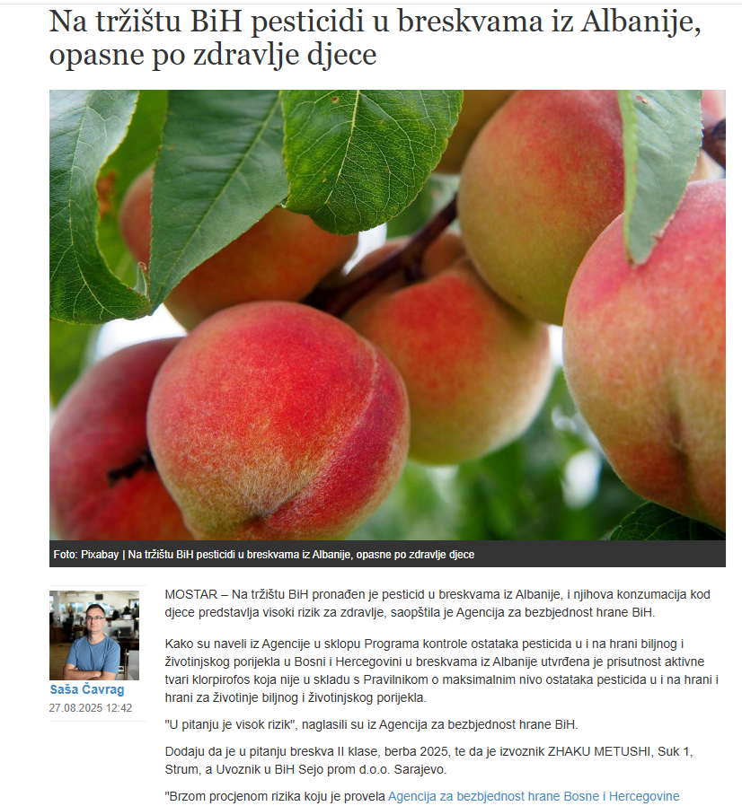 Sipas mediave boshnjake, ngarkesë me pjeshkë nga Shqipëria kishte përmbajtje të lartë të substancës “klorpirifos”, një pesticid i ndaluar. Përdorimi i tyre përbën rrezik për shëndetin, sidomos për fëmijët.