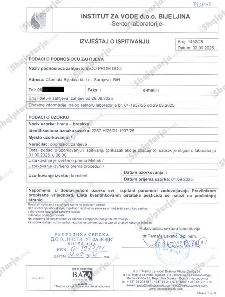 (Foto: Rezultati i analizave boshnjake për pjeshkët e eksportuara nga kompania shqiptare)