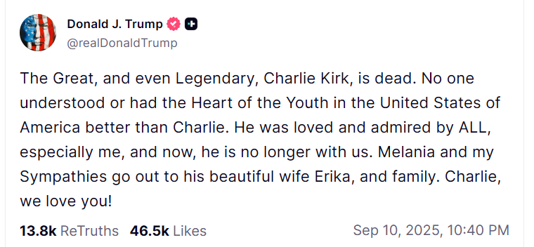 “I Madhi, madje edhe Legjendari, Charlie Kirk, ka vdekur. Askush nuk e kuptoi dhe nuk e kishte Zemrën e të Rinjve në Shtetet e Bashkuara të Amerikës më mirë se Charlie. Ai ishte i dashur dhe i admiruar nga të GJITHË, veçanërisht nga unë, dhe tani, ai nuk është më me ne. Melania dhe ngushëllimet e mia shkojnë për gruan e tij të bukur Erika dhe familjen. Charlie, të duam!”