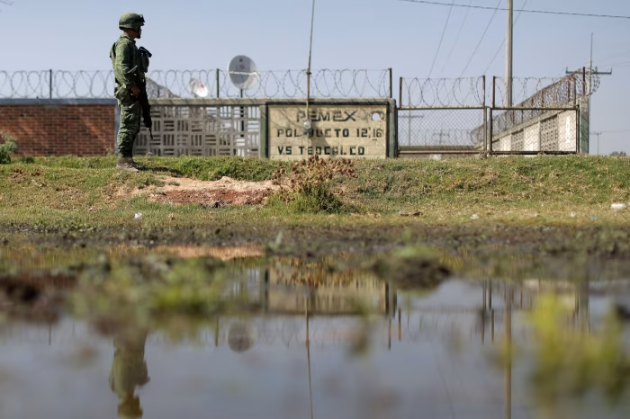 Një ushtar ruan një tubacion nafte Pemex gjatë krizës së karburantit në vitin 2019. Ndikimi i forcave të armatosura u rrit në mënyrë dramatike nën ish-presidentin Andrés Manuel López Obrador © Hector Vivas/Getty Images