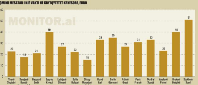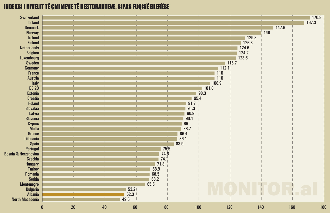 Kjo do të thotë se ushqimi në restorante dhe akomodimi në Shqipëri kushtojnë gati 50% më pak se mesatarja e vendeve të BE-së. Shqipëria është më e lirë se vende të rajonit si Turqia (68.9), Rumania (68.5) apo Bullgaria (53.2) – dhe shumë më e lirë se shtete si Italia (106.9), Franca (110.0) apo Gjermania (112.1).